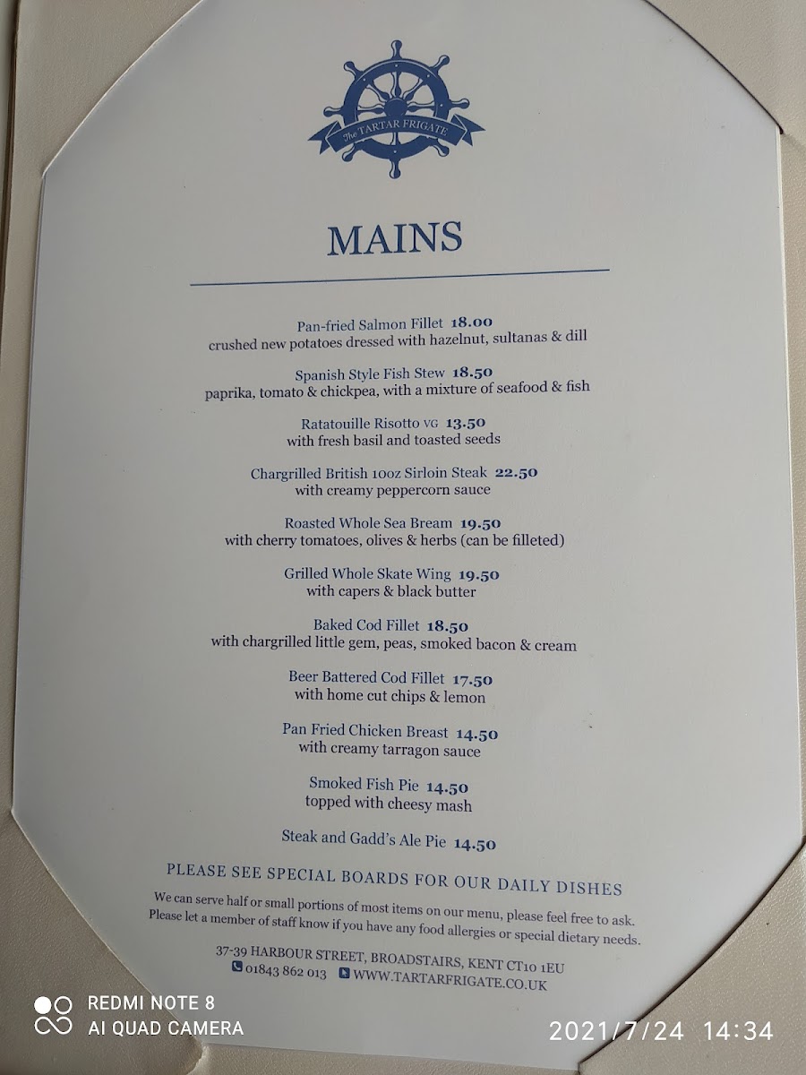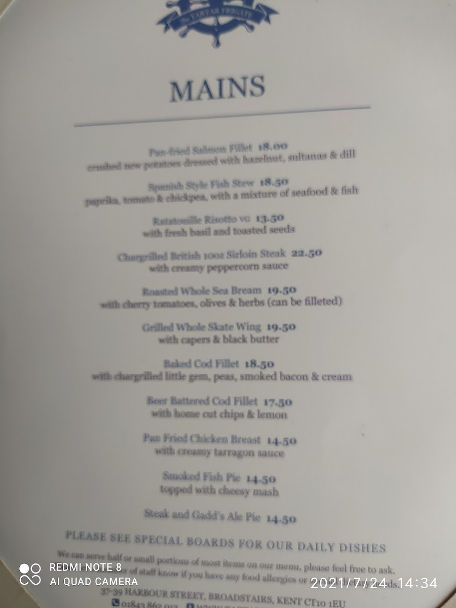 Introducing the menu at The Tartar Frigate, located on Harbour St in Broadstairs, is a delightful journey into the world of seafood. This charming restaurant, situated above a historic pub, excels in offering a variety of dishes that highlight the freshness and quality of its ingredients. Customers rave about the warm and attentive service, where knowledgeable staff provide exemplary recommendations.